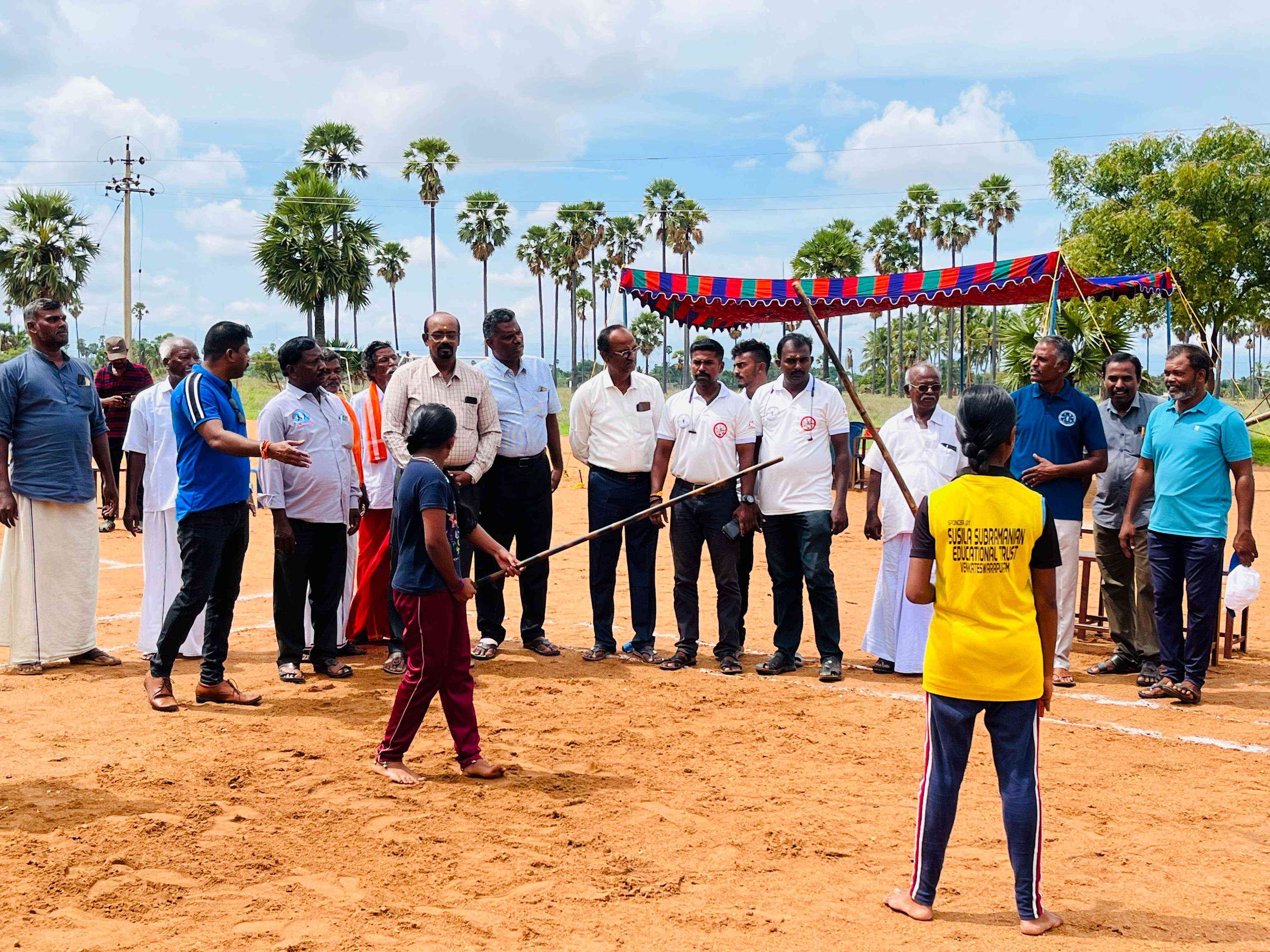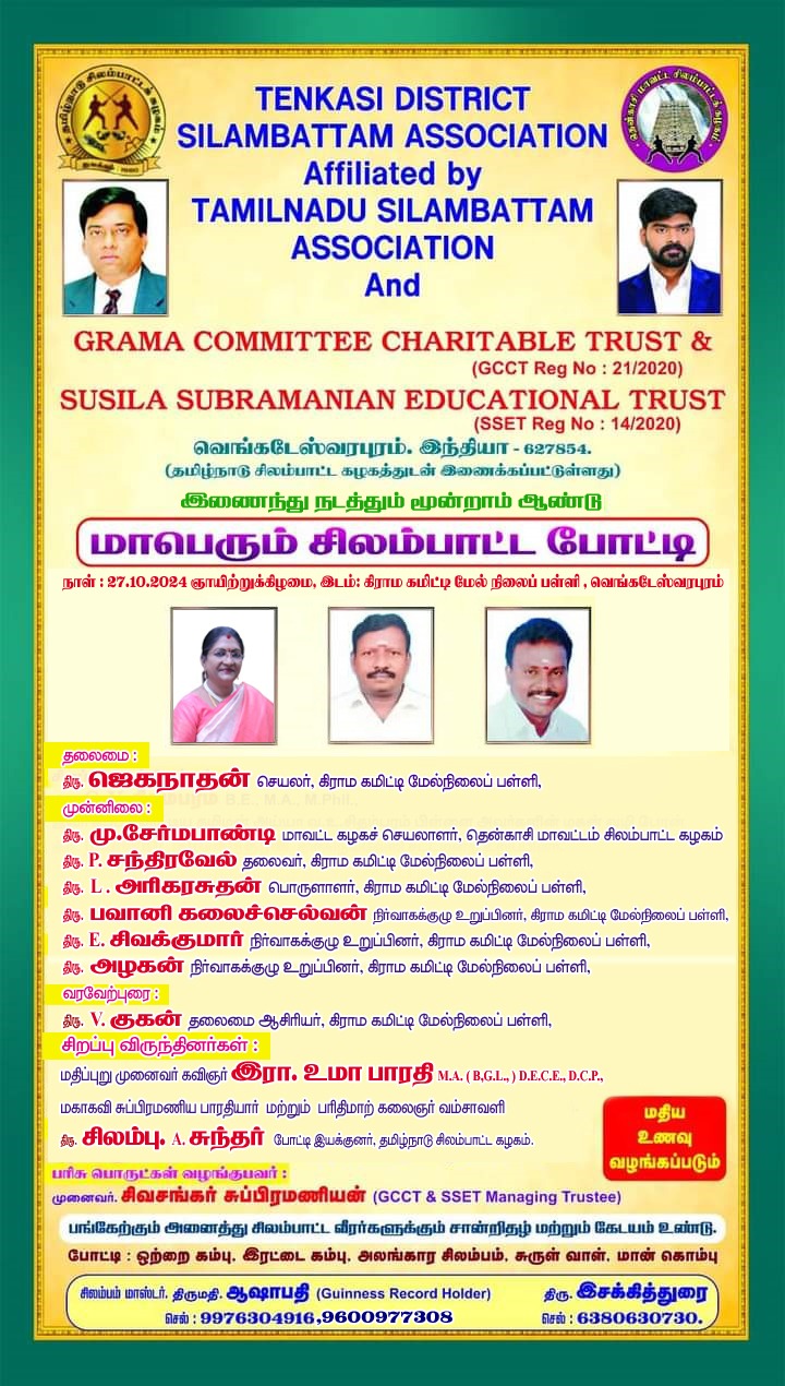 சுசிலாசுப்பிரமணியன் எஜுகேஷனல் டிரஸ்ட் & கிராமகமிட்டி சாரிட்டபிள் டிரஸ்ட் நடத்தும் நான்காம் ஆண்டு மாவட்ட அளவிலான சிலம்பப் போட்டியில் தென்காசி மாவட்டத்தின் பல பகுதிகளில் இருந்து பத்திற்கும் மேற்பட்ட அணிகள் கலந்து கொண்டு சிறப்பித்தனர் . தொடக்க நிகழ்ச்சியாக சுசிலா சுப்ரமணியன் எஜுகேஷன் டிரஸ்டின் பரதநாட்டிய குழுவினர் வரவேற்றனர் . இதற்கான ஏற்பாடுகளை பரதநாட்டிய கலைஞர் திருமதி காளிதங்கம் திருமதி சரஸ்வதி செந்தில் ஏற்பாடு செய்து இருந்தனர் . நிகழ்ச்சியின் சிறப்பு விருந்தாக காமராஜர் அவர்களின் பேத்தி மயூரி காமராஜர் அவர்கள் கலந்துகொண்டு சிறப்பித்தார் . கிராம கமிட்டி சாரிட்டபிள் டிரஸ்ட் சார்பாக திரு ஜெகநாதன் ஆசிரியர் அவர்கள் கலந்து கொண்டார் . பரிசுகளை வழங்கியவர் சுசிலா சுப்பிரமணியன் எஜுகேஷன் டிரஸ்டின் முனைவர். சு. சிவசங்கர் அவர்கள் . மேலும் விளையாட்டுப் போட்டியினை சிறப்பாக வழி நடத்தியவர் திரு மு சேர்மப்பாண்டி தென்காசி சிலம்பாட்ட கழக தலைவர் அவர்கள் . நிகழ்ச்சியினை சிறப்பாக ஒருங்கிணைத்தவர்கள் சிவக்குமார் ஆசிரியர், அழகன் ஆசிரியர், குமார் ஆசிரியர் மற்றும் மகேஸ்வரன் ஆசிரியர் சுசீலாசுப்பிரமணியன் எஜுகேஷன் ட்ரஸ்டின் சார்பாக தா.தீபக் அவர்கள் மற்றும் செந்தில். பொ and ஆகாஷ் செந்தில்.